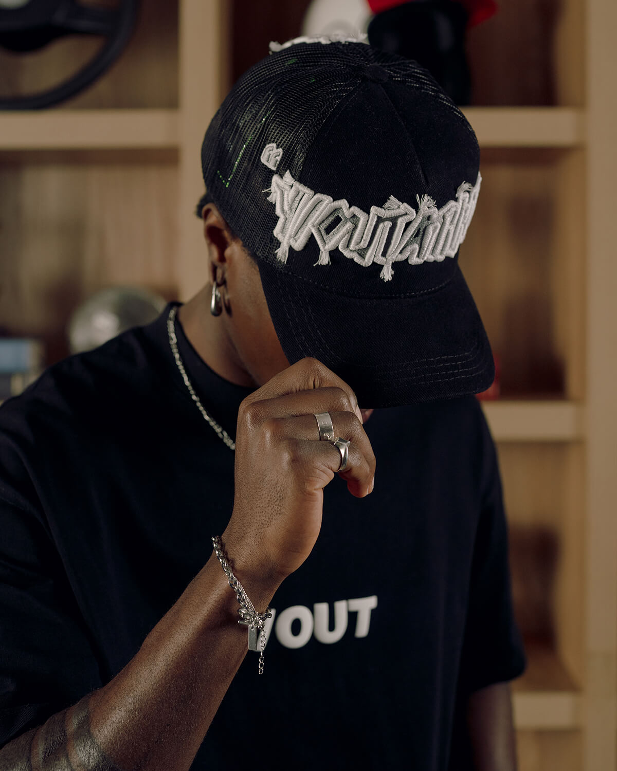 Una gorra que con su gráfica bordada y aplicación de pedrería aporta brillo y dimensión, elevando la pieza con un contraste loudly y carácter statement.