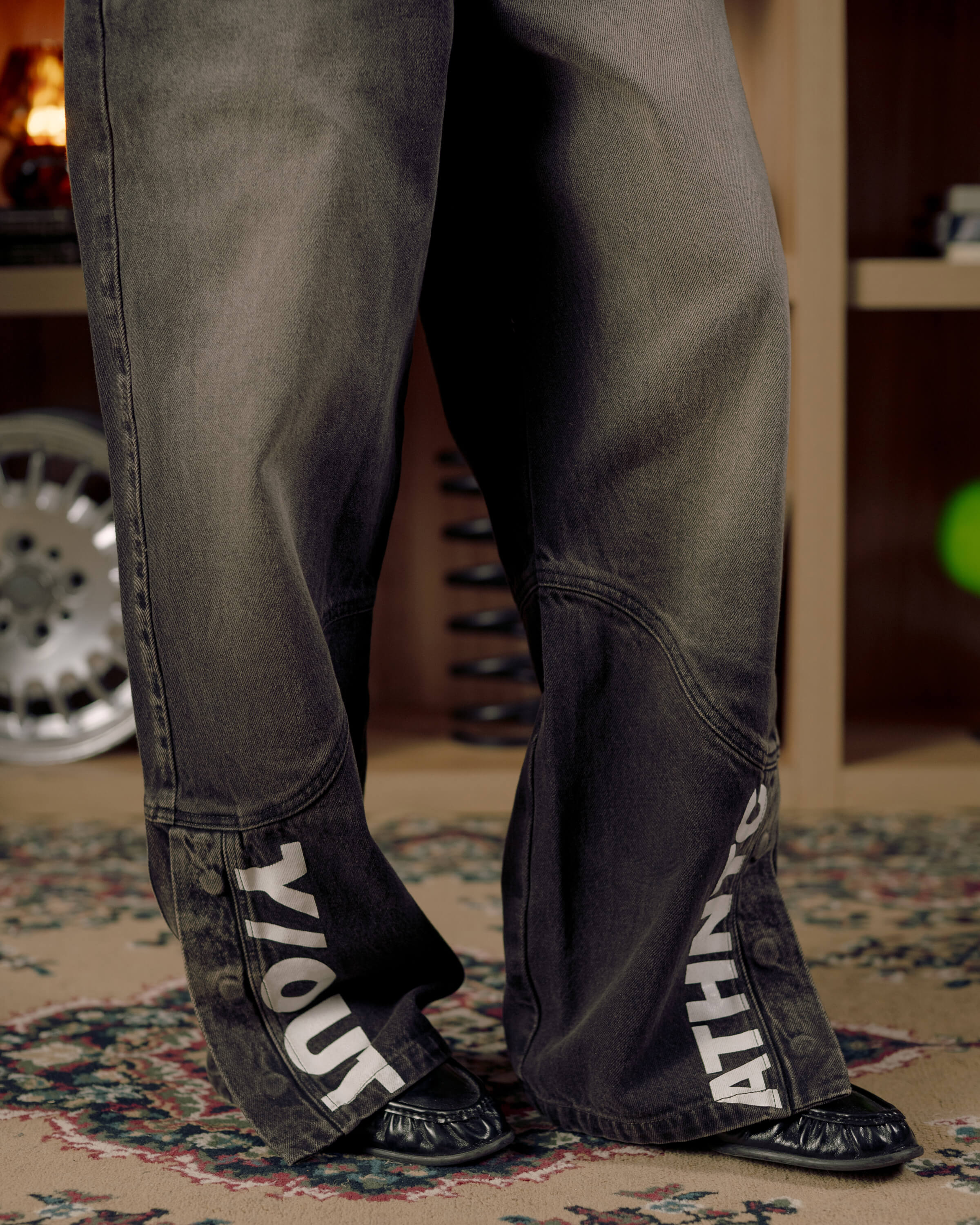 Un jean negro con lavado que resalta la textura y le da un look desgastado. Su silueta recta, el gráfico y los botones en bota lo convierten en una pieza clave para construir looks streetwear loudly