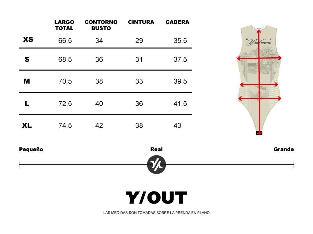 Un bodysuit en lycra con gráfica sublimada inspirada en una playa icónica. Sus cortes laterales y abertura en la espalda estilizan la silueta y aportan frescura con actitud urbana.