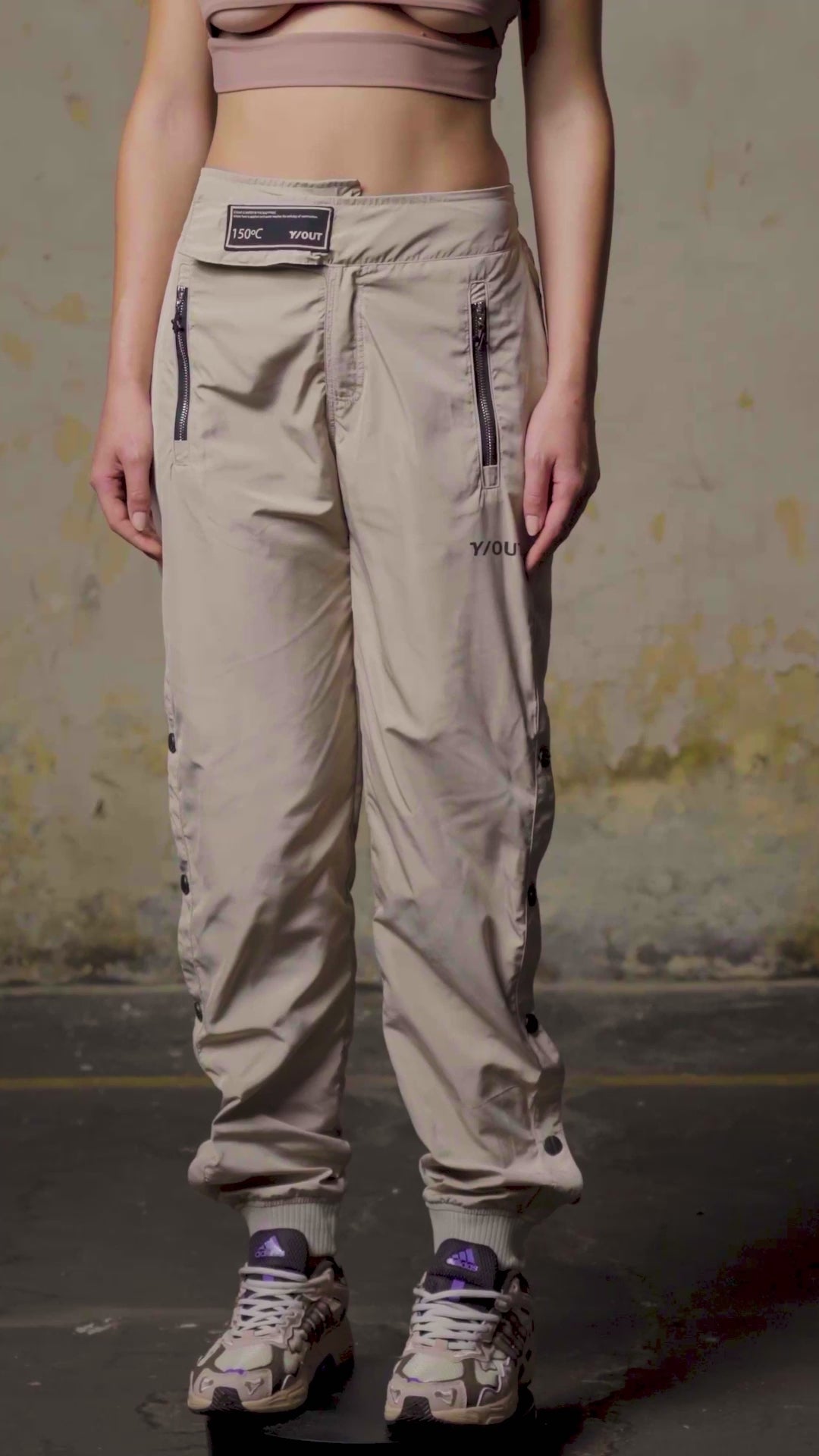 Un pantalón tipo jogger en tela antifluido, que puedes usar con los broches de los lados abiertos que le dan un estilo con botas englobadas o úsalo con los broches cerrados para que quede con la caída de un jogger normal